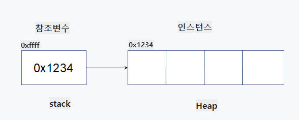 - 인스턴스는 new 연산자로 heap영역의 메모리에 할당되고 참조변수는 할당된 heap 영역의 인스턴스 메모리 주소를 저장한다.